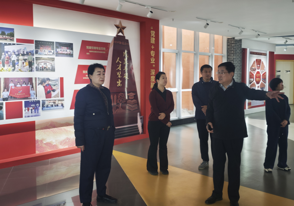 訪談前,李校長(zhǎng)實(shí)地考察了新聞傳播學(xué)院質(zhì)量文化墻建設(shè)。李校長(zhǎng)指出,新聞傳播學(xué)院質(zhì)量文化墻建設(shè)搞得很好,各板塊設(shè)計(jì)風(fēng)格統(tǒng)一又各具特色,內(nèi)容豐富,能夠較好地展示學(xué)院辦學(xué)特色、教學(xué)成果和建設(shè)亮點(diǎn)。李校長(zhǎng)建議在黨建板塊可以增設(shè)一些桌椅,為學(xué)生學(xué)習(xí)提供更多便利。